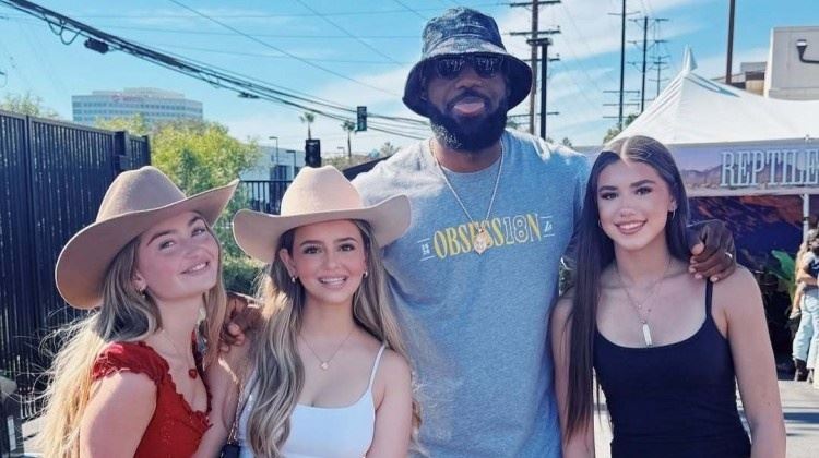 嫂子知道不?詹姆斯参加球队户外活动与三位美女合影还俏皮吐舌