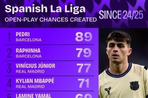西甲运动战创造机会次数排行:佩德里、拉菲尼亚前2 维尼修斯第3