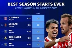 德转列五大联赛球队赛季前13场最佳开局:拜仁&92年米兰并列居首