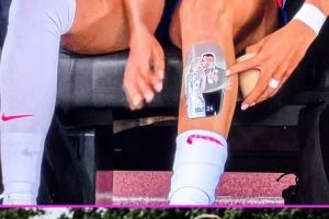 比赛中,镜头捕捉到在替补席做准备的凯莉护腿板上印着她与丈夫斯科特-摩尔在婚礼上接吻的画面,两人于一年前完婚。